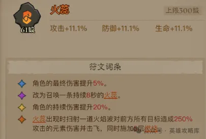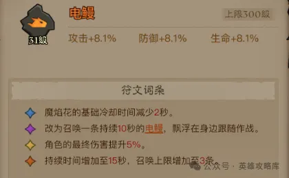 英雄没有闪魔焰花是一个召唤炮台的输出技能,根据符文选择的不同,提供燃烧或者触电层数的额外叠加。“火蕊”符文可以提升最终伤害与持续伤害,提供燃烧叠层和一次击飞效果;“电鳗”符文减少技能的冷却,提高自身最终伤害,并将攻击改为附加触电效果!