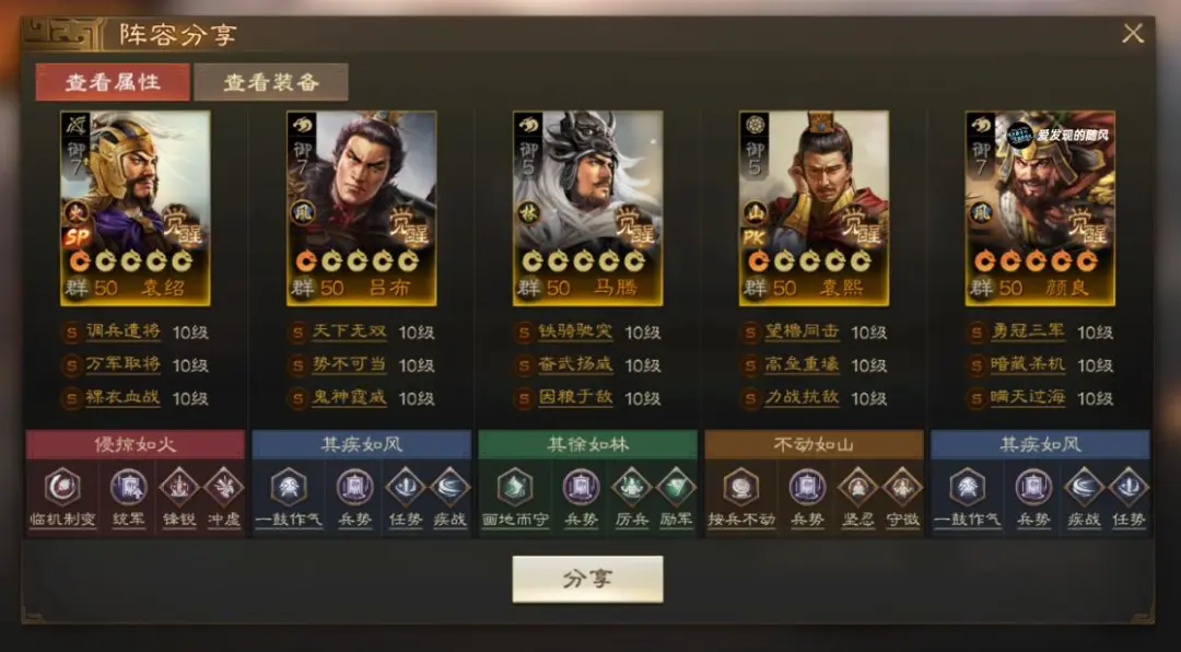 颜良&文丑可以触发四世三公羁绊,配合SP袁绍和袁熙,这个队伍自带前三回合的断粮,非常适合快攻队。而SP袁绍、吕布、颜良&文丑的输出都非常可观,这里让颜良&文丑带瞒天过海+暗藏杀机,类似徐盛的带法,远程狙击封被动,吕布SP袁绍收割。