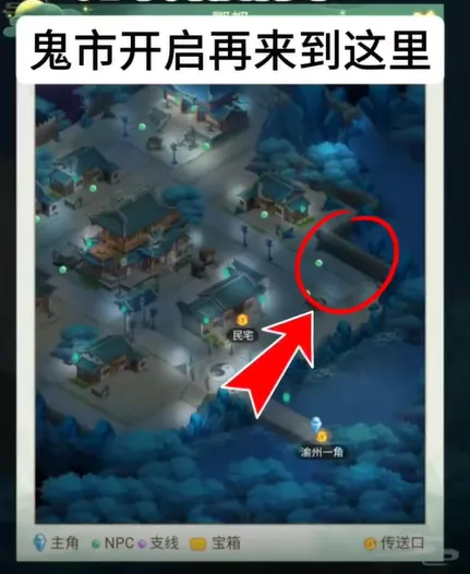 与百姓对话,得知酆都的鬼市在每天亥时开启,于是晚上21:00-23:00鬼市开启期间来到酆都下图所示位置。