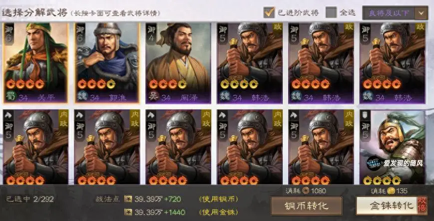 白板三星卡转化战法是20点,满红的三星卡转化战法是80点,白板四星卡转化战法是80点,满红四星卡转战法是400点,所以先把四星卡进阶,然后就算是白板四星卡的用处也比满红三星卡大。