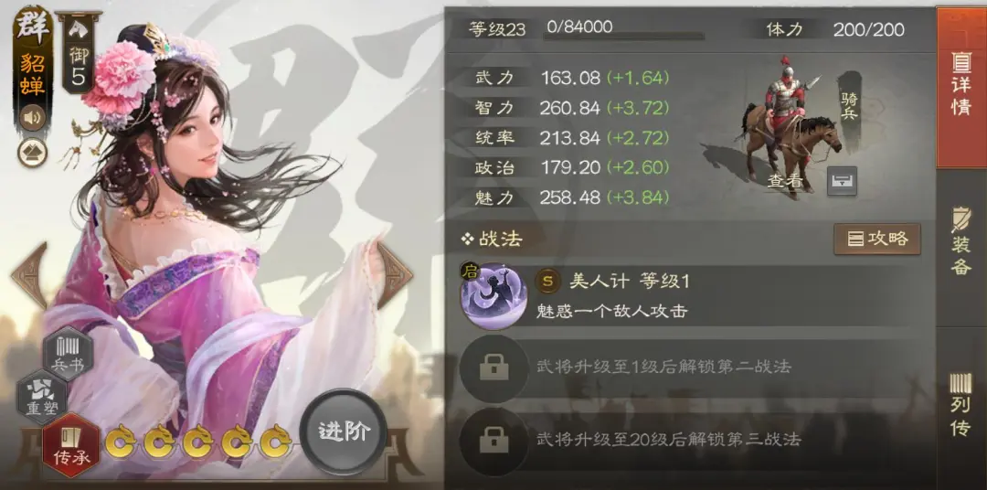 夏侯惇,魏国6御骑兵,属性除了智力都还算不错。