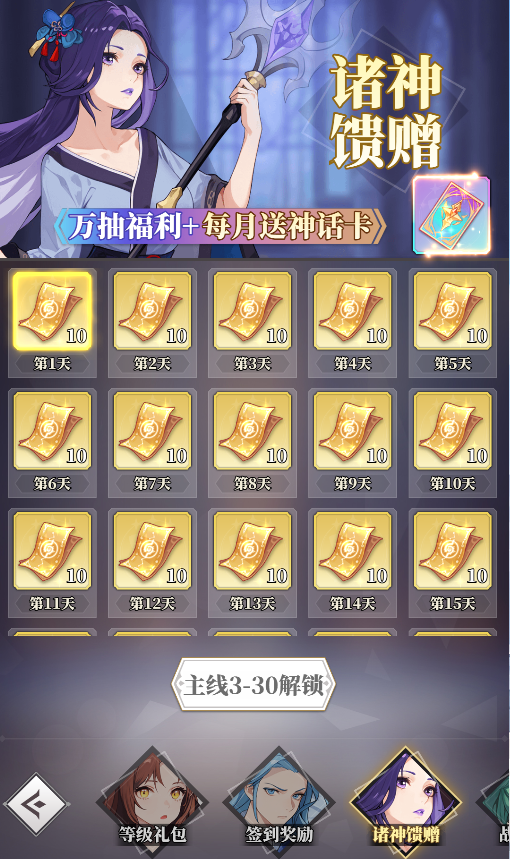 2.在线资源多多,新玩家在线30分钟可免费获得灵玉*100、随机五星神灵*1、SSR卡自选包*1、请神符*10以及若干材料。
